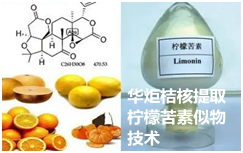 柠檬苦素类似物是存在于芸香科和楝科植物中的一类三萜化合物。近年来研究表明柠檬苦素似物能够较强地激活体内主要解毒酶——谷胱甘肽转移酶的活性,大量动物实验表明,柠檬苦素类化合物具有抑制由化学物质导致的肝癌、小肠癌、口腔癌等癌症,是一类开发价值很高的生理活性物质。 提取技术是天然药物研究工作的基础,柠檬苦素类似物的提取原料很多,以枳实、陈皮、橘核、柚核等芸香科柑橘属植物药材为原料,均能分离纯化出柠檬苦素类似物,但是较难分离出高含量的柠檬苦素、诺米林,进一步的分离纯化研究工作开展较少。市场所需规格的产品缺乏,急需开发一种能够快速高效、精确分离纯化、提取含量高的柠檬苦素类似物工艺。