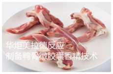华炬新产品研究所技术咨询委员会科研人员现推荐一项美拉德反应制备鸭骨微胶囊香精技术方法,该技术产品微胶囊鸭骨香精制备方法通过将鸭骨香精活性成份经过两次包埋工艺,很好地保护了易氧化的高不饱和脂肪酸,显著地降低了其氧化速率,大大提高了鸭骨香精抗氧化能力,产品保存效果好,保质期长,风味浓郁持久,同时选用可食性包埋壁材,有益于人体健康;最大限度的保存了鸭骨中各种营养成分和风味物质,解决了鸭骨香精油脂氧化易酸败的问题,有效地延长了鸭骨香精的储存时间;不但解决了鸭骨的废弃污染问题,还提高了附加值及经济效益,而且还为人类提供了全天然、安全、多功效的新型食用香精,因此市场前景广阔,易于大规模生产,现将该美拉德反应制备鸭骨微胶囊香精技术方法实例介绍如下供研究参考:(311341 347475)