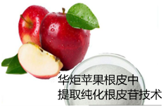 华炬新产品研究所技术咨询委员会科研人员现推荐一项苹果根皮中提取纯化根皮苷技术工艺,该技术是一种从苹果根皮中提取纯化根 皮苷的方法,该方法工艺流程简单,生产成本低,污染小,适合工业 化生产。 一是在工艺过程中,树脂吸附洗脱不用梯度洗脱,从而避免了分段 收集的复杂工艺。二是在工艺过程中,只使用了乙醇有机溶剂,减少了产品中的有害 溶剂残留,提高了产品质量。三是该方法所得的根皮苷含量≥97%,有效成分回收率在80%以上,现将该苹果根皮中提取纯化根皮苷技术工艺及实例介绍如下供研究参考:(241211 225617)