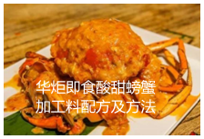华炬新产品研究所技术咨询委员会科研人员现推荐一项即食酸甜螃蟹加工料配方及方法,该技术产品的使用加工的酸甜螃蟹方便携带,开袋即可食用,营养丰富,口感好,有着开胃消食的功效等。现将该即食酸甜螃蟹加工料配方及方法实例介绍如下供研究参考:(341341 231565)