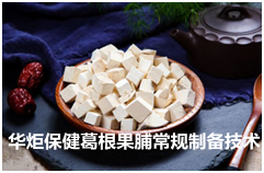 华炬科技新产品研究所技术咨询委员会科研人员现推荐一项保健葛根果脯常规制备技术,该技术产品原料丰富,制备方法简单,其产品质量好,易保存食用,营养丰富,香甜可口,无异味,口感好,开创了葛根食用的新途径,有显著的经济和社会效益,现将该保健葛根果脯常规制备技术及实例介绍如下供研究参考:(441251 625553)