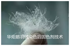 常见的鹅羽绒为白色,将白色鹅羽绒染色后可作为无胆布、透明布的填充物,进一步加工成无胆布羽绒服等,增加服装的时尚度。鹅羽绒染色工艺包括除渍工序、染色工序、固色工序、清洗工序和烘干工序。针对鹅羽绒染色后固色技术,生产出的鹅羽绒染色羽绒色牢度、蓬松度好的产品,华炬新产品研究所技术咨询委员会科研人员现推荐一项鹅羽绒染色后固色剂技术配方,该技术产品的使用能使染色鹅羽绒具有色牢度好的优点,且加工工艺具有生产效率高、环境污染少的优点,得到的染色鹅羽绒产品色彩鲜艳、光泽度好,且根据此工艺步骤染色后的鹅羽绒经过100℃的热水浸泡,冷却后基本不掉色,现将该鹅羽绒染色后固色剂技术配方介绍如下供研究参考:(311371 421565)