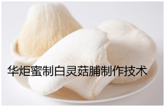 华炬新产品研究所技术咨询委员会科研人员现推荐一项蜜制白灵菇脯制作技术方法,该技术产品表面晶莹剔透,口感香甜有韧性,具有白灵菇应有的鲜美滋味及气味,质地柔软并富有弹性,风味独特;本产品营养丰富,口感鲜美,可以调节人体生理平衡,增强人体免疫功能,具有消积镇咳等保健功效,现将该蜜制白灵菇脯制作技术方法及实例介绍如下供研究参考:(211471 341511)