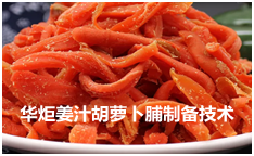 华炬新产品研究所技术咨询委员会科研人员现推荐一项姜汁胡萝卜脯制备技术工艺,该技术以胡萝卜为载体,浸入白糖和姜汁,制成风味独特、口感好、营养丰富、让人们爱吃的休闭脯,制备工艺经过热烫处理和加入山梨酸钾,确保胡萝卜脯不变色,保质期达24个月以上,比现有技术延长一倍时间,而且工序简单,易于操作,现将该姜汁胡萝卜脯制备技术工艺及实例介绍如下供研究参考:(211371  227571