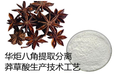 华炬新产品研究所技术咨询委员会科研人员现推荐一项八角提取分离莽草酸生产技术工艺,该技术工艺解决了生产加工八角茴香果实中存在的问题,具有生产周期短,有效成分回收率高,生产工艺简单,自动化程度高,生产成本低等显著优点;根据八角茴香的化学成分特点,将陶瓷膜分离澄清,离子交换树脂提纯,大孔吸附树脂脱色等关键生产工业环节有效结合起来,工业化批量生产出了莽草酸≥98%、颜色为白色的高品质八角提取物,现将该八角提取分离莽草酸生产技术工艺及实例介绍如下供研究参考:(371511 651541)
