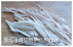 牛蒡丝具有牛蒡的独特风味,香辣浓郁,酸甜适口,一般加工程序为:原料→精选→清洗→去皮→清水保存→切丝→护色→热烫→沥水→调味→包装→杀菌→成品检验。其中牛蒡丝护色是一个重要的技术环节,华炬科技新产品研究所技术咨询委员会科研人员现推荐一项牛蒡切丝护色剂技术配方, 该技术产品具有原料简单易购,使用方法简单,卫生安全,经济价廉的特点,现将该牛蒡切丝护色剂技术配方及方法介绍如下供研究参考:(441271 561557)