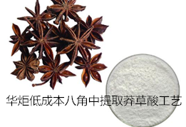 华炬新产品研究所技术咨询委员会科研人员现推荐一项低成本八角中提取莽草酸工艺方法,该技术生产工艺简单,生产过程中清洁无污染物排放,对环境污染小, 生产周期短,生产成本低,更易于推广掌握,提取得到的产品纯度可达98% 以上,现将该低成本八角中提取莽草酸工艺方法及实施例介绍如下供研究参考:(371511 651639)