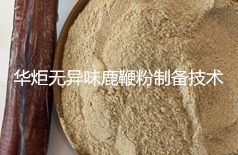 鹿鞭,又名鹿肾,鹿冲。为鹿科动物梅花鹿或马鹿雄性的外生殖器。其味甘、咸, 性温, 归肝、肾经。具有补肾阳, 益精血的功能, 可用于治疗劳损, 腰膝酸痛, 肾虚, 耳鸣, 阳痿, 宫冷不孕等症。可熬膏或入丸、散剂。鹿鞭粉用温水冲服,异味特重,口感很差,提供一种改善鹿鞭粉口感的方法,十分必要。华炬新产品研究所技术咨询委员会科研人员现推荐一项无异味鹿鞭粉制备技术方法,该技术鹿鞭加入一种改善鹿鞭粉口感的添加剂粉碎,口服异味小,口感好,现将该无异味鹿鞭粉制备技术方法及实施例介绍如下供研究参考:(311771 381297)