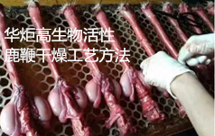 鹿鞭,又名鹿肾,鹿冲。为鹿科动物梅花鹿或马鹿雄性的外生殖器。其味甘、咸, 性温, 归肝、肾经。具有补肾阳, 益精血的功能, 可用于治疗劳损, 腰膝酸痛, 肾虚, 耳鸣, 阳痿, 宫冷不孕等症。可熬膏或入丸、散剂。鹿鞭粉用温水冲服,异味特重,口感很差,提供一种改善鹿鞭粉口感的方法,十分必要。现有文献记载的鹿鞭干燥方法是:割取的鲜鹿鞭,除净残肉及油脂,固定于木板上风干。这种方法干燥的鹿鞭,口服异味较重。 研究一种疗效好、口服异味小的鹿鞭加工方法,十分必要。华炬新产品研究所技术咨询委员会科研人员现推荐一项高生物活性鹿鞭干燥工艺方法,该技术制得的鹿鞭生物活性高,口服异味小。加工制成的鹿鞭壮阳作用好于风干鹿鞭,现将该高生物活性鹿鞭干燥工艺方法及实施例介绍如下供研究参考:(311771 381177)