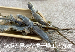 华炬科技新产品研究所技术咨询委员会科研人员现推荐一项无异味壁虎干燥工艺方法,该技术是一种壁虎新的干燥方法,制得的壁虎口服异味小,生物活性高,口服无异味,病人的顺应性高,现将该无异味壁虎干燥工艺方法及实施例介绍如下供研究参考:(441291 841342)