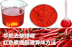 华炬新产品研究所技术咨询委员会科研人员现推荐一项去除辣椒红色素提取液异味方法,该技术方法可去除液体辣椒红色素提取液异味,工艺成本低、效果好,喷雾干燥得到的粉末产品也无异味,能够充分拓展辣椒红色素提取液的应用领域,现将该去除辣椒红色素提取液异味方法及实施例介绍如下供研究参考:(211341 217431)
