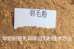 华炬新产品研究所技术咨询委员会科研人员现推荐一项制备无异味羽毛粉技术方法,该技术主要有以下效果:1、采用相似相溶原理,在不破坏产品蛋白营养价值的前提下,对羽毛粉进行脱水溶性和脱醇溶性臭味处理,产品总得率达到85.3~90.8%;2、操作过程条件温和,操作简便,无污染,所用溶剂实现了重复利用,节约了生产成本,制备的脱臭羽毛粉可广泛用于纺织、食品等领域,具有巨大的社会和经济价值,现将该制备无异味羽毛粉技术方法及实施例介绍如下供研究参考:(311311 381398)