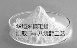 华炬新产品研究所技术咨询委员会科研人员现推荐一项米糠毛蜡制取二十八烷醇工艺,该技术的有益效果在于:1、以米糠毛蜡为原料制取二十八烷醇的方法,以氢氧化钙为催化剂,在甲醇存在的条件下,应用相转移技术对米糠毛蜡进行水解反应得到高碳脂肪酸皂和高碳脂肪酸混合物,由于氢氧化钙在米糠毛蜡水解过程中部分转化为氯化钙,可作为沉淀剂,使水解和沉淀过程同时进行,不需要二次添加沉淀剂,反应过程更快,反应条件为常温、常压,密闭回流,无泄漏。2.以米糠毛蜡为原料制取二十八烷醇的方法,采用现有的超临界萃取装置,萃取工艺易控制,萃取的混合高碳脂肪醇纯度更高,然后通过真空精馏,可以保证提取的二十八烷醇产品达到90%以上。3、以米糠毛蜡为原料制取二十八烷醇的方法,直接以米糠毛蜡为原料,省去了精制米糠蜡整个工艺过程,节能减排效果明显,反应时间短,收得率高,纯度高,无跑冒滴漏,节能环保,价格低,综合能耗低,生产成本低,适用于工业生产,现将该米糠毛蜡制取二十八烷醇工艺及实施例介绍如下供研究参考:(211211 255359)