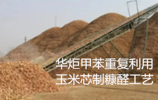 华炬新产品研究所技术咨询委员会科研人员现推荐一项甲苯重复利用玉米芯制糠醛工艺,该技术与现有技术相比所具有的有益效果是:在先将玉米芯微粉碎后,利用甲醇进行浸泡提取,将其中的半纤维素溶解,与固体分离;半纤维素在酸性条件下脱水环化转化为糠醛,生成的糠醛在搅拌条件下转入甲苯中,避免发生副反应,蒸馏回收甲苯后即得糠醛。出现的固体未经过酸处理,残留的甲醇易挥发,容易处理,不影响后续的使用。实现了甲醇和硫酸的分离和重复使用,并先将微粉玉米芯中溶解到甲醇中的部分纤维素进行物理分离,同时能够得到副产物纤维素。水解的过程中利用甲苯基本不断地将生成的糠醛分离,还促进水解正向进行,大大的提高了收率。所用的甲苯能够蒸馏回收,重复利用,现将该甲苯重复利用玉米芯制糠醛工艺及实施例介绍如下供研究参考:(211211 243312)