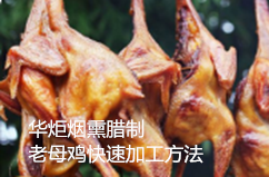 华炬新产品研究所技术咨询委员会科研人员现推荐一项烟熏腊制老母鸡快速加工方法,该技术的优点是:1、不受天气的影响,不怕腌制老母鸡在高温天气酸败、变质,成品存放,不怕腌制老母鸡在高温天气酸败、变质和霉变。因此,加工和贮存出来的烟熏腊制品品质有保证;2、本发明一年四季,随时随地都可以加工烟熏腊老母鸡;3、烟熏腊制品加工时间短,只需6-28小时。腊制品加工时间越短,在加工烟熏腊制品过程中发生酸败和变质的概率就越少;4、加工出来的烟熏腊老母鸡鸡皮和鸡肉柔软,不需存放也可食用,且烟味较轻或无烟味,仍保持烟熏腊制品的特有风味;5、烟熏腊老母鸡及时冷冻,风味更佳,而且贮存一年以上没问题;6、加工和贮存的烟熏腊老母鸡制癌物少;7、在加工与贮存中不加亚硝酸钠和防腐剂。采用本方法加工出来的老母鸡鸡皮、鸡肉柔软,富有弹性,无烟味,味道鲜美,口感好,且不含亚硝酸盐,冷冻储藏后食用烟熏腊老母鸡风味更佳,现将该烟熏腊制老母鸡快速加工方法及实施例介绍如下供研究参考:(311311 443325)